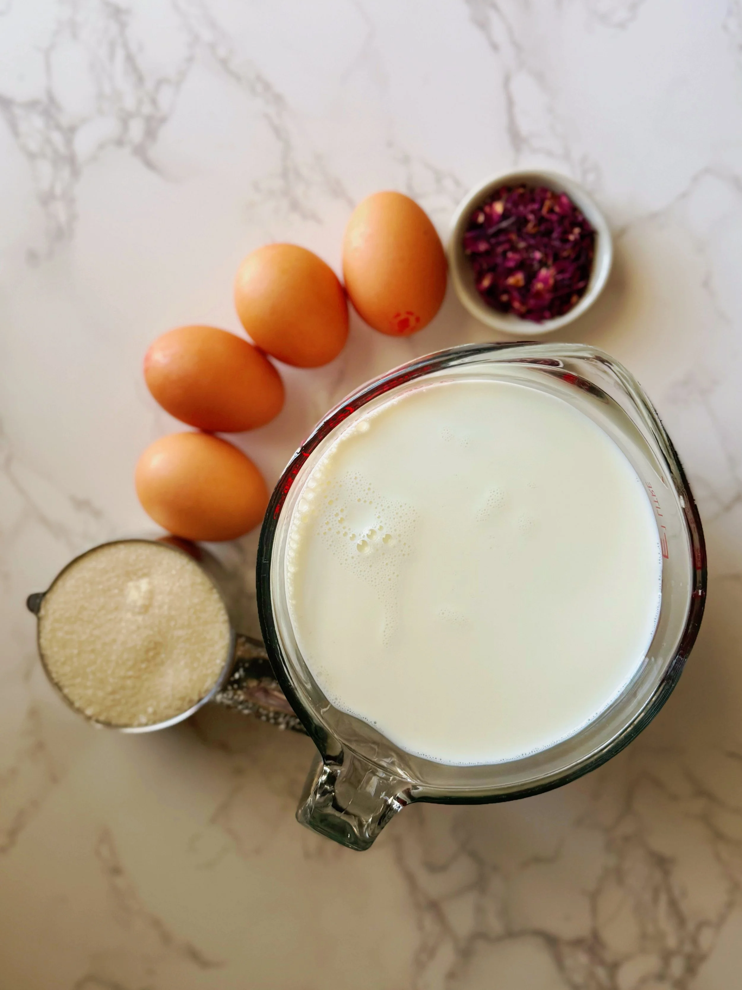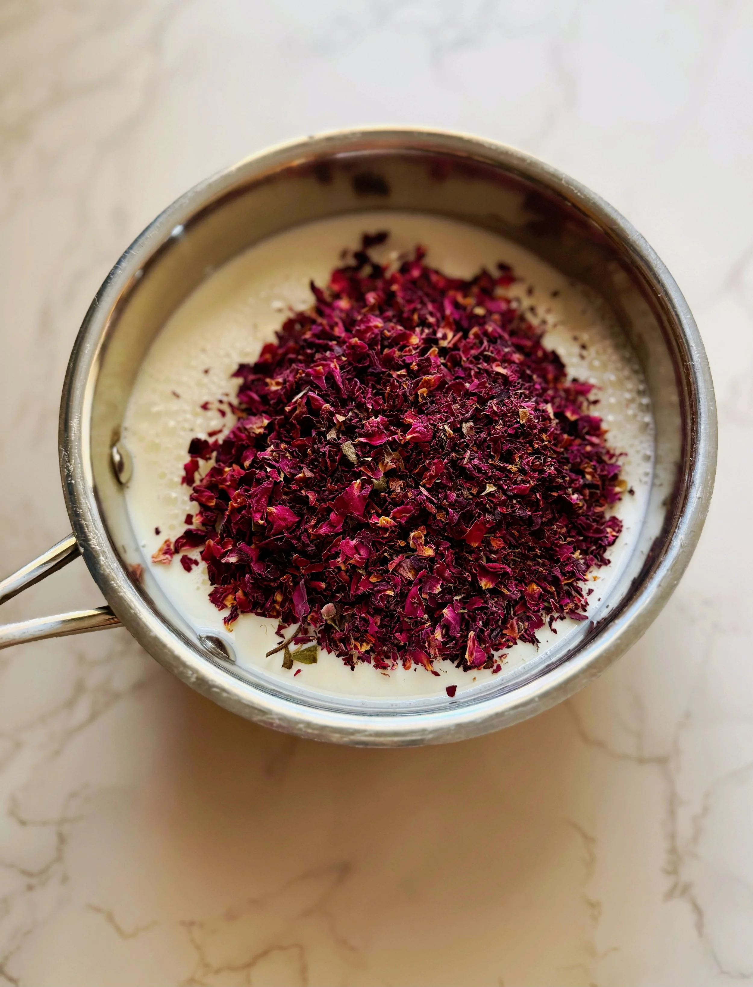 In a small pot bring 4 cups of whole milk to simmer. Stir in 6-8 tbsp dried rose petals and simmer for 15-20 minutes over medium low heat. Stir in 3/4 cup sugar and continue to simmer for another 5 minutes. Turn off the heat and let it steep for another 10 minutes. Strain through a fine sieve and discard the solids. Temper egg yolks by slowly drizzling in the hot milk while whisking vigorously. Then pour back in the pot and cook over low heat for 10 minutes until slightly thickened. Remove from heat and transfer to a bowl to cool. Whisk in food coloring if desired. Cover and cool completely, then refrigerate until cold. Churn in an ice cream maker for 35-45 minutes until the consistency is similar to soft serve. Transfer in a freezer safe container and freeze over night.