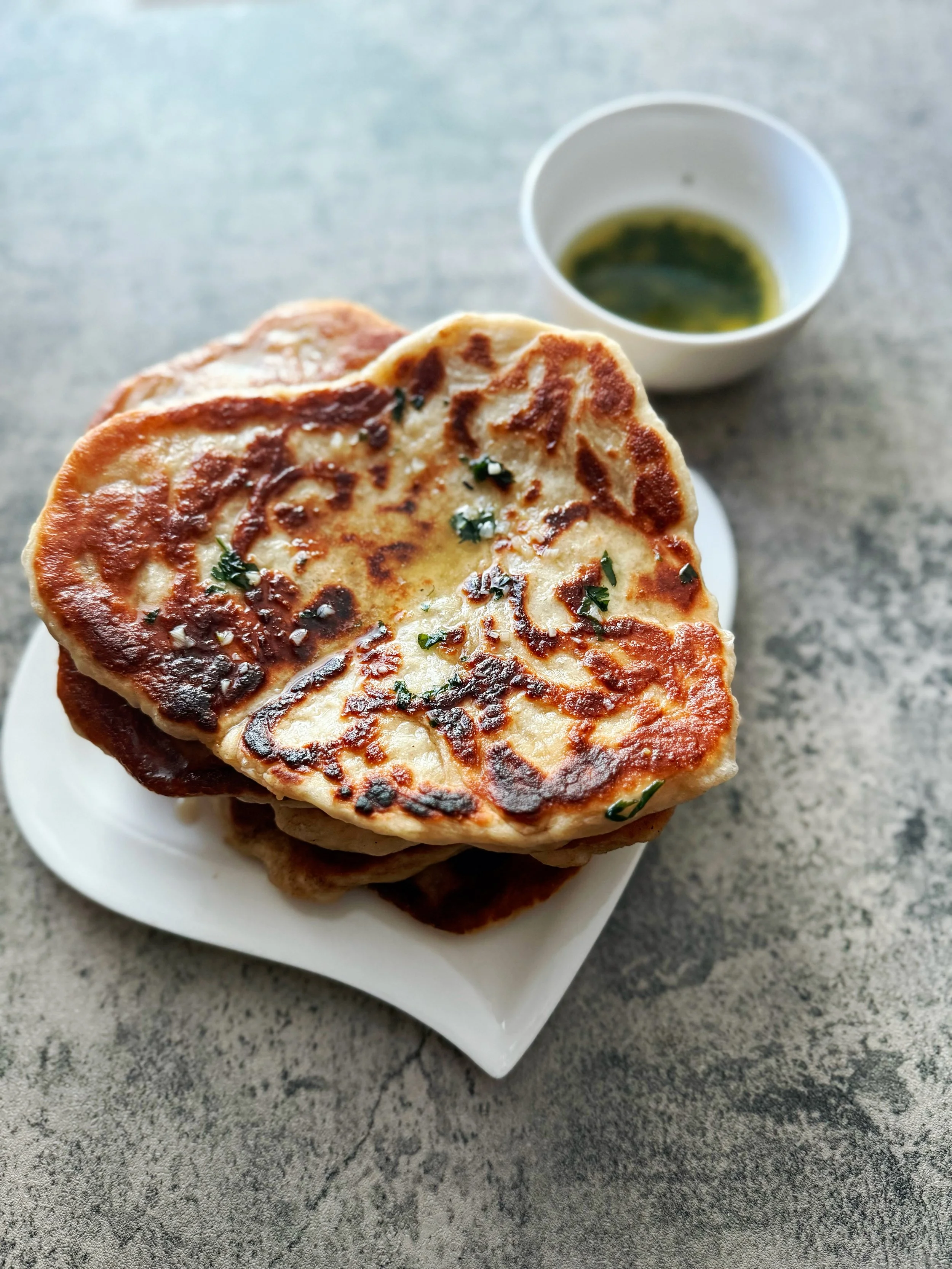 Naan stands apart from many other flatbreads because it’s leavened and enriched giving it a softer texture. While many traditional flatbreads (like tortillas and lavash) are made from simple doughs of flour, water, and salt, naan usually includes ingredients like yeast, yogurt, or milk, which help create a lighter crumb. The added fat from yogurt, butter, or ghee also makes the bread more tender and flexible. Historically naan was cooked in a tandoor; a cylindrical clay oven heated with wood or charcoal. The dough is stretched into rounds and slapped directly against the inner wall of the oven where it quickly puffs, chars in spots, and cooks in just a few minutes. Because most home kitchens don’t have a tandoor naan is often cooked in a very hot skillet or cast iron pan which mimics some of that high heat. The dough still puffs and browns, though without the vertical oven walls the shape stays flatter. Brushing the finished bread with melted butter, garlic, or herbs is also traditional.